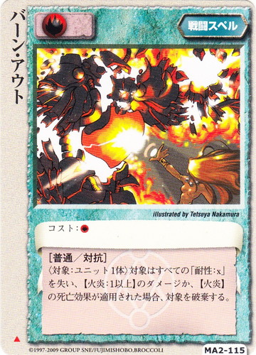 ![]() ![]() | MA2-115 バーン・アウト 戦闘スペル 千年皇国の栄光 ▲ 属性:火 コスト:火 [普通/対抗] 〈対象:ユニット1体〉対象はすべての「耐性:x」を失い、【火炎:1以上】のダメージか、【火炎】の死亡効果が適用された場合、対象を破棄する。 illustrated by Tetsuya Nakamura |