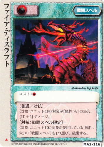 ![]() ![]() | MA2-116 ファイア・ディスラプト 戦闘スペル 千年皇国の栄光 ▲ 属性:火 コスト:火 [普通/対抗] 〈対象:ユニット1体〉対象が「属性:火」の場合、【1D+2】ダメージ。 [対抗:戦闘スペル限定] 〈対象:ユニット1体〉対象が使用している「属性:火」の「戦闘スペル」を1つ選び、破棄する。 illustrated by Yuji Kaida |