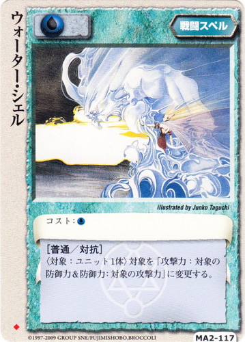 ![]() ![]() | MA2-117 ウォーター・シェル 戦闘スペル 千年皇国の栄光 ◆ 属性:水 コスト:水 [普通/対抗] 〈対象:ユニット1体〉対象を「攻撃力:対象の防御力&防御力:対象の攻撃力」に変更する。 illustrated by Junko Taguchi |