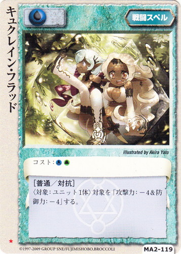 ![]() ![]() | MA2-119 キュクレイン・フラッド 戦闘スペル 千年皇国の栄光 ★ 属性:水 コスト:水土 [普通/対抗] 〈対象:ユニット1体〉対象を「攻撃力:-4&防御力:-4」する。 illustrated by Akira Yato |