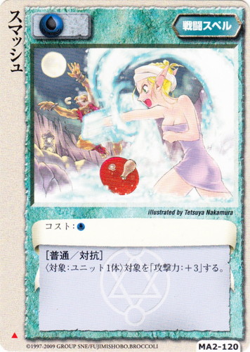![]() ![]() | MA2-120 スマッシュ 戦闘スペル 千年皇国の栄光 ▲ 属性:水 コスト:水 [普通/対抗] 〈対象:ユニット1体〉対象を「攻撃力:+3」する。 illustrated by Tetsuya Nakamura |