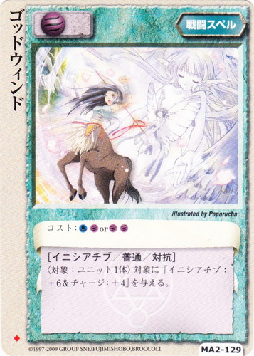 ![]() ![]() | MA2-129 ゴッドウィンド 戦闘スペル 千年皇国の栄光 ◆ 属性:風 コスト:水風or風風 [イニシアチブ/普通/対抗] 〈対象:ユニット1体〉対象に「イニシアチブ:+6&チャージ:+4」を与える。 illustrated by Poporucha |