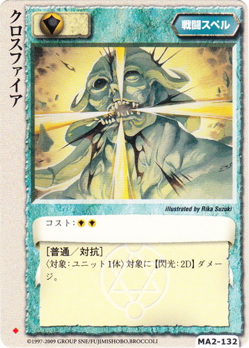 ![]() ![]() | MA2-132 クロスファイア 戦闘スペル 千年皇国の栄光 ◆ 属性:聖 コスト:聖 [普通/対抗] 〈対象:ユニット1体〉対象に【閃光:2D】ダメージ。 illustrated by Rika Suzuki |