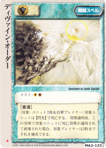 ![]() ![]() | MA2-133 ディヴァイン・オーダー 戦闘スペル 千年皇国の栄光 ★ 属性:聖 コスト:聖 [普通] 〈対象:ユニット1体&自軍プレイヤー〉対象ユニットは【閃光】で死亡する。効果適用後、この効果で対象ユニットに死亡効果が適用されて破棄された場合、対象プレイヤーは2枚まで手札を補充できる。 illustrated by Junko Taguchi |