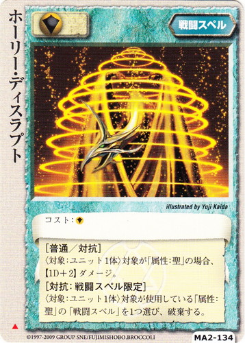![]() ![]() | MA2-134 ホーリー・ディスラプト 戦闘スペル 千年皇国の栄光 ▲ 属性:聖 コスト:聖 [普通/対抗] 〈対象:ユニット1体〉対象が「属性:聖」の場合、【1D+2】ダメージ。 [対抗:戦闘スペル限定] 〈対象:ユニット1体〉対象が使用している「属性:聖」の「戦闘スペル」を1つ選び、破棄する。 illustrated by Yuji Kaida |
