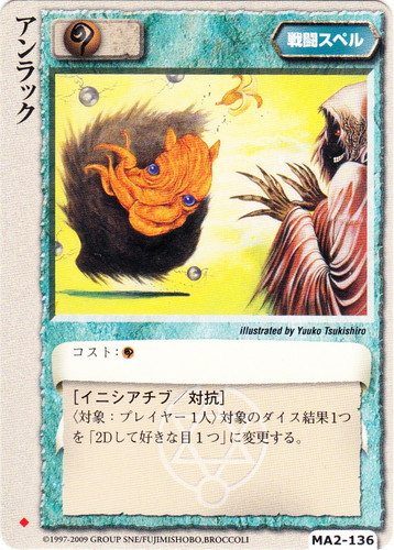 ![]() ![]() | MA2-136 アンラック 戦闘スペル 千年皇国の栄光 ◆ 属性:魔 コスト:魔 [イニシアチブ/対抗] 〈対象:プレイヤー1人〉対象のダイス結果1つを「2Dして好きな目1つ」に変更する。 illustrated by Yuuko Tsukishiro |