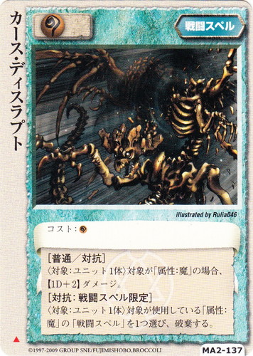 ![]() ![]() | MA2-137 カース・ディスラプト 戦闘スペル 千年皇国の栄光 ▲ 属性:魔 コスト:魔 [普通/対抗] 〈対象:ユニット1体〉対象が「属性:魔」の場合、【1D+2】ダメージ。 [対抗:戦闘スペル限定] 〈対象:ユニット1体〉対象が使用している「属性:魔」の「戦闘スペル」を1つ選び、破棄する。 illustrated by Rulia046 |