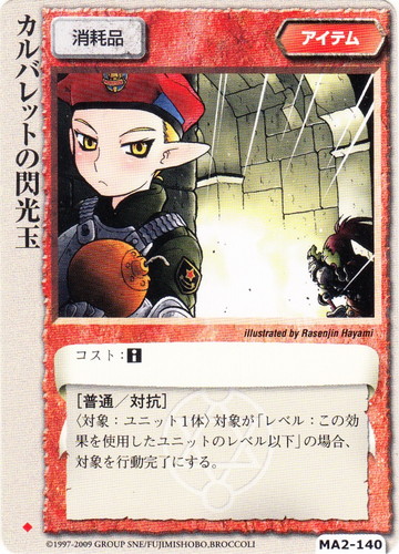 ![]() ![]() | MA2-140 カルバレットの閃光玉 アイテム 千年皇国の栄光 ◆ 分類:消耗品 コスト:■ [普通/対抗] 〈対象:ユニット1体〉対象が「レベル:この効果を使用したユニットのレベル以下」の場合、対象を行動完了にする。 illustrated by Rasenjin Hayami |