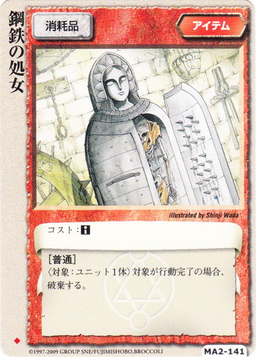 ![]() ![]() | MA2-141 鋼鉄の処女 アイテム 千年皇国の栄光 ◆ 分類:消耗品 コスト:■ [普通] 〈対象:ユニット1体〉対象が行動完了の場合、破棄する。 illustrated by Shinji Wada |