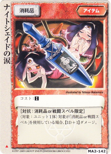 ![]() ![]() | MA2-142 ナイトシェイドの涙 アイテム 千年皇国の栄光 ▲ 分類:消耗品 コスト:■ [対抗:消耗品or戦闘スペル限定] 〈対象:ユニット1体〉対象が「消耗品or戦闘スペル」を使用している場合、【1D+1】ダメージ。 illustrated by Tetsuya Nakamura |