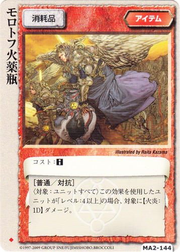 ![]() ![]() | MA2-144 モロトフ火炎瓶 アイテム 千年皇国の栄光 ◆ 分類:消耗品 コスト:■ [普通/対抗] 〈対象:ユニットすべて〉この効果を使用したユニットが「レベル:4以上」の場合、対象に【火炎:1D】ダメージ。 illustrated by Raita Kazama |