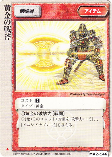![]() ![]() | MA2-146 黄金の戦斧 アイテム 千年皇国の栄光 ▲ 分類:装備品 タイプ:黄金 コスト:■ ○黄金の破壊力[戦闘] 〈対象:このユニット〉対象を「攻撃力:+5」し、「イニシアチブ:-2」を与える。 illustrated by Tamaki Ishigaki |