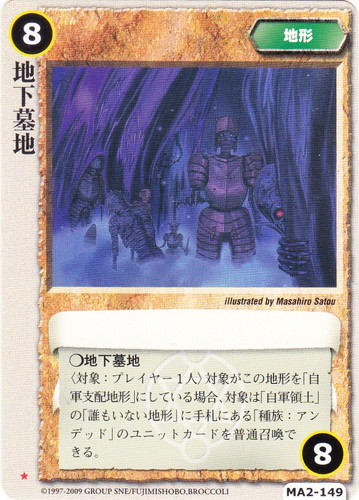 ![]() ![]() | MA2-149 地下墓地 地形 千年皇国の栄光 ★ リミット:8 ○地下墓地 〈対象:プレイヤー1人〉対象がこの地形を「自軍支配地形」にしている場合、対象は「自軍領土」の「誰もいない地形」に手札にある「種族:アンデッド」のユニットカードを普通召喚できる。 illustrated by Masahiro Satou |