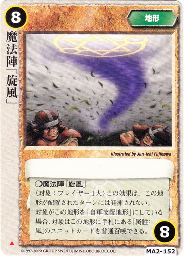 ![]() ![]() | MA2-152 魔法陣「旋風」 地形 千年皇国の栄光 ▲ リミット:8 ○魔法陣「旋風」 〈対象:プレイヤー1人〉この効果は、この地形が配置されたターンには発揮されない。対象がこの地形を「自軍支配地形」にしている場合、対象はこの地形を手札にある「属性:風」のユニットカードを普通召喚できる。 illustrated by Jun-ichi Fujikawa |