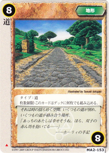 ![]() ![]() | MA2-153 道 地形 千年皇国の栄光 ▲ リミット:8 タイプ:道 それは時の揺らめく空間。いくつもの道が別れ、いくつもの道が絡み合う場所。 「あっちのあたしは幸せそうね。ほら、双子の赤ん坊を抱いてる・・・・・・」 ――ホーリィの手記 illustrated by Tamaki Ishigaki |