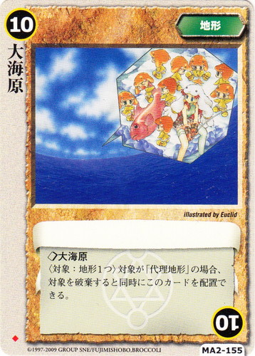 ![]() ![]() | MA2-155 大海原 地形 千年皇国の栄光 ◆ リミット:10 ◇大海原 〈対象:地形1つ〉対象が「代理地形」の場合、対象を破棄すると同時にこのカードを配置できる。 illustrated by Euclid |