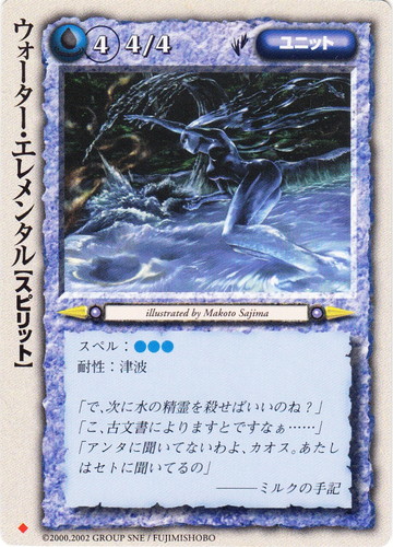 ![]() ![]() | ウォーター・エレメンタル ユニット 真珠竜の秘宝 ◆ 属性:水 種族:スピリット レベル:4 攻撃力:4 防御力:4 進軍タイプ:歩行 スペル:水水水 耐性:津波 「で、次に水の精霊を殺せばいいのね?」 「こ、古文書によりますとですなぁ・・・・・・」 「アンタに聞いてないわよ、カオス。あたしはセトに聞いてるの」 ――ミルクの手記 illustrated by Makoto Sajima |
