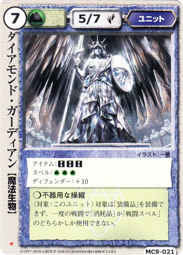 ![]() ![]() | MC9-021 ダイアモンド・ガーディアン ユニット 紅河宮の精霊 ★ 属性:土 種族:魔法生物 レベル:7 攻撃力:5 防御力:7 進軍タイプ:歩行 アイテム:■■■ スペル:土土土 ディフェンダー:+10 ○不器用な操縦 〈対象:このユニット〉対象は「装備品」を装備できず、一度の戦闘で「消耗品」か「戦闘スペル」のどちらかしか使用できない。 illustrated by 一徳 |