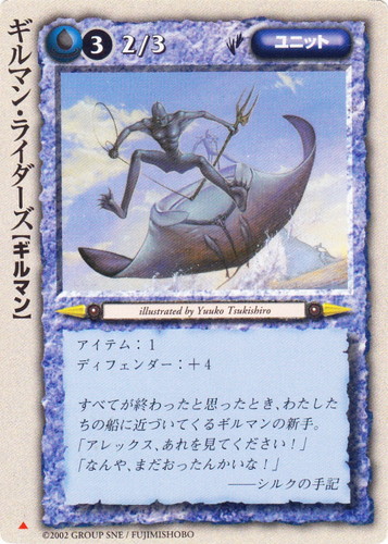 ![]() ![]() | グランド・ホバー ユニット 冥界の六皇子 ▲ 属性:風 種族:フィッシュ レベル:(3) 攻撃力:3 防御力:3 進軍タイプ:飛行 イニシアチブ:+1 「フカヒレ、カマボコは逃したけど、刺身だけは譲れへんでぇ!とお!」 ――シルクの手記 illustrated by Naoko Kanazawa |
