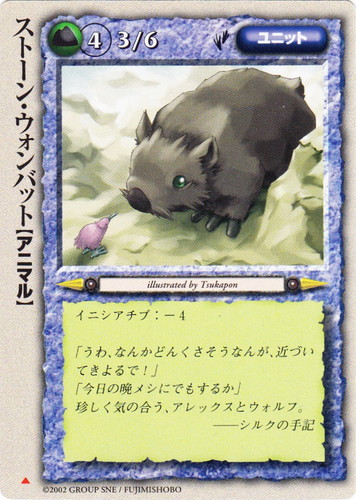 ![]() ![]() | ストーン・ウォンバット ユニット 冥界の六皇子 ▲ 属性:土 種族:アニマル レベル:4 攻撃力:3 防御力:6 進軍タイプ:歩行 イニシアチブ:-4 「うわ、なんかどんくさそうなんが、近づいてきよるで!」 「今日の晩メシにでもするか」 珍しく気の合う、アレックスとフォルフ。 ――シルクの手記 illustrated by Tsukapon |