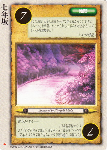 ![]() ![]() | 七年坂 地形 冥界の六皇子 ▲ リミット:7 「この坂は、七年の歳月をかけて作られたらしいですよ」 「ふーん、七年殺しやったら知ってるんやけどなあ。っていうか得意技やし」 ――シルクの手記 illustrated by Hiroyuki Ishida |