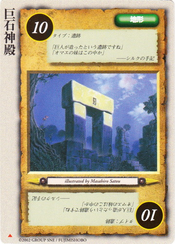![]() ![]() | 巨石神殿 地形 冥界の六皇子 ▲ リミット:10 タイプ:遺跡 「巨人が造ったという遺跡ですね」 「オマエの妹はこの中か」 ――シルクの手記 illustrated by Masahiro Satou |