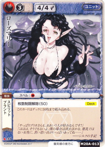 ![]() ![]() | M20B-010 オーク禿鷲騎士団 ユニット 月の銀の魔狼 ▲ 属性:火 種族:ビースト/オーク ブロック:AN レベル:(4) 攻撃力:4 防御力:3 進軍タイプ:飛行 勢力:ブクマルタ興亡記 イニシアチブ:+1 アイテム:□ スペル:* 枚数制限解除(50)【Deck】 このカードはデックに50枚まで組み込める。 「なるほど、わかりましたブリオ様。オーク族はあなたに大恩があります。それを今ここで返しましょう」 ブリアンナ様が命令を下すと、オークたちが禿鷲に乗って行きました。これで一安心です。 ――シルクの手記 illustrated by 七水剛多 |