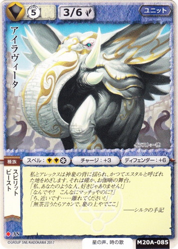 ![]() ![]() | M20A-085 アイラヴィータ ユニット 太陽の金の竜姫 ◆ 属性:聖 種族:ビースト/スピリット ブロック:AN レベル:5 攻撃力:3 防御力:6 進軍タイプ:歩行 勢力:星の声、時の歌 スペル:聖聖* チャージ:+3 ディフェンダー:+6 私とアレックスは神象の背に揺られ、かつてエスタルと呼ばれた地をめざします。それは確か、お伽噺の舞台。 「私、あなたのような人、好きじゃありません!」 「なんでや?こんなマッチョやのに?」 「ち、近いです・・・・・・離れてください!」 「無茶言うたらアカンで、象の上やでここ」 ――シルクの手記 illustrated by 一徳 |
