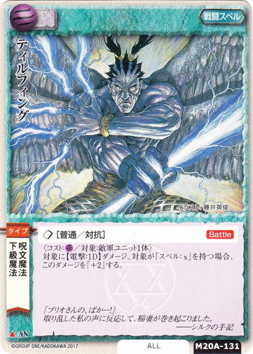 ![]() ![]() | M20A-131 ティルフィング 戦闘スペル 太陽の金の竜姫 ▲ 属性:風 ブロック:AN 勢力:ALL タイプ:下級魔法/呪文魔法 ◇[普通/対抗]【Battle】 〈コスト:風/対象:敵軍ユニット1体〉 対象に【電撃:1D】ダメージ。対象が「スペル:x」を持つ場合、このダメージを「+2」する。 「ブリオさんの、ばかー!」 取り乱した私の声に反応して、稲妻が巻き起こりました。 ――シルクの手記 illustrated by 藤井英俊 |