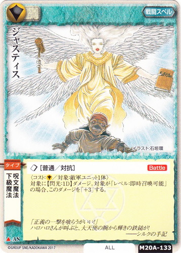 ![]() ![]() | M20A-P13 ジャスティス 戦闘スペル プロモーションカード(20th Anniversary) ▲ 属性:聖 ブロック:AN 勢力:ALL タイプ:下級魔法/呪文魔法 ◇[普通/対抗]【Battle】 〈コスト:聖/対象:敵軍ユニット1体〉 対象に【閃光:1D】ダメージ。対象が「レベル:即時召喚可能」の場合、このダメージを「+3」する。 「あたしの赤角が!なんてことしてくれるのよ!」 「ミルク!よもや私の顔を忘れたわけではあるまいな!」 ――シルクの手記 illustrated by 柏餅よもぎ |