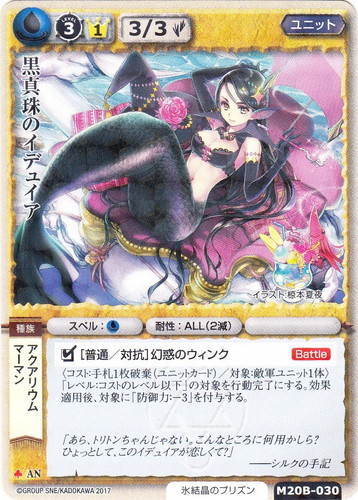 ![]() ![]() | M20B-030 黒真珠のイデュイア ユニット 月の銀の魔狼 ♣ 属性:水 分類:英雄 種族:マーマン/アクアリウム ブロック:AN レベル:(3) 英雄点:1 攻撃力:3 防御力:3 進軍タイプ:歩行 勢力:氷結晶のプリズン スペル:水 耐性:ALL(2減) □[普通/対抗]幻惑のウィンク【Battle】 〈コスト:手札1枚破棄(ユニットカード)/対象:敵軍ユニット1体〉 「レベル:コストのレベル以下」の対象を行動完了にする。効果適用後、対象に「防御力:-3」を付与する。 「あら、トリトンちゃんじゃない。こんなところに何用かしら?ひょっとして、このイデュイアが恋しくて?」 ――シルクの手記 illustrated by 椋本夏夜 |