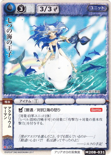 ![]() ![]() | M20B-031 七つの海の王子 ユニット 月の銀の魔狼 ★ 属性:水 種族:マーマン/アクアリウム ブロック:AN レベル:(3) 攻撃力:3 防御力:3 進軍タイプ:歩行 勢力:アリアオロの双魚宮 アイテム:□ □[普通/対抗]海の怒り【Battle】 〈対象:自軍ユニット1体〉 「レベル:即時召喚不可」の対象に「攻撃力:+対象の基本攻撃力」を付与する。 「僕がアエリアを選んだこと、今でも恨んでいるのか・・・・・・」 「勘違いしないで!私は譲ってやったのよ!」 ――シルクの手記 illustrated by 相沢美良 |