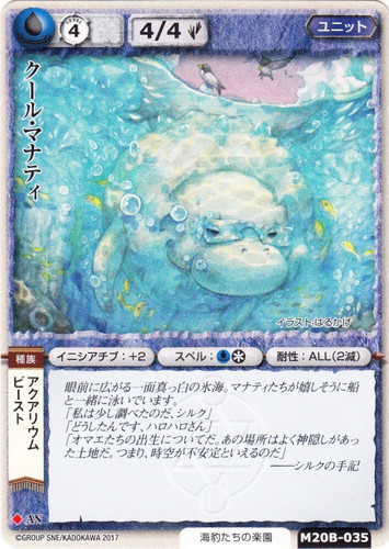 ![]() ![]() | M20B-035 クール・マナティ ユニット 月の銀の魔狼 ◆ 属性:水 種族:ビースト/アクアリウム ブロック:AN レベル:4 攻撃力:4 防御力:4 進軍タイプ:歩行 勢力:海豹たちの楽園 イニシアチブ:+2 スペル:水* 耐性:ALL(2減) 眼前に広がる一面真っ白の氷海。マナティたちが嬉しそうに船と一緒に泳いでいます。 「私は少し調べたのだ、シルク」 「どうしたんです、ハロハロさん」 「オマエたちの出生についてだ。あの場所はよく神隠しがあった土地だ。つまり、時空が不安定といえるのだ」 ――シルクの手記 illustrated by はるかげ |