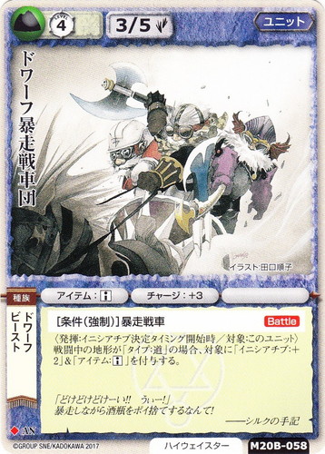 ![]() ![]() | M20B-058 ドワーフ暴走戦車団 ユニット 月の銀の魔狼 ◆ 属性:土 種族:ビースト/ドワーフ ブロック:AN レベル:4 攻撃力:3 防御力:5 進軍タイプ:歩行 勢力:ハイウェイスター アイテム:□ チャージ:+3 [条件(強制)]暴走戦車【Battle】 〈発揮:イニシアチブ決定タイミング開始時/対象:このユニット〉 戦闘中の地形が「タイプ:道」の場合、対象に「イニシアチブ:+2」&「アイテム:□」を付与する。 「どけどけどけーい!!うぃー!」 暴走しながら酒瓶をポイ捨てするなんて! ――シルクの手記 illustrated by 田口順子 |