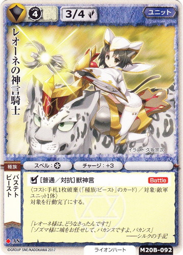![]() ![]() | M20C-P07 獅子姫レオーネ ユニット 20th Anniversary スペシャルサプライセット 召喚士 ♣ 属性:聖 分類:英雄 種族:ビースト/バステト ブロック:AN レベル:(4) 英雄点:1 攻撃力:3 防御力:4 進軍タイプ:歩行 勢力:ライオンハート アイテム:弾 スペル:* チャージ:+3 ◎[普通|対抗不可]ライオンバズーカ・改【Battle】 〈コスト:手札2枚破棄/対象:敵軍ユニット1体〉 対象が行動完了かつコストのいずれかが「錬金弾のカード」または「「種族:ビーストのカード」の場合、対象に【2D】ダメージ。 □[普通/対抗]獅子咆哮弾・改【Battle】 〈コスト:山札1~2枚破棄/対象:敵軍ユニットすべて〉 コストのいずれかが「錬金弾のカード」または「英雄のカード」の場合、対象を行動完了にする。 「獅子姫からの依頼よ。この杖を龍銃にしてよね」 ――シルクの手記 illustrated by 柴乃櫂人 |