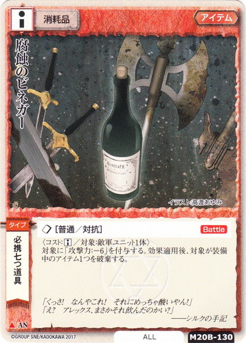 ![]() ![]() | M20B-130 腐蝕のビネガー アイテム 月の銀の魔狼 ▲ 分類:消耗品 ブロック:AN 勢力:ALL タイプ:必携七つ道具 ◇[普通/対抗]【Battle】 〈コスト:□/対象:敵軍ユニット1体〉 対象に「攻撃力:-6」を付与する。効果適用後、対象が装備中のアイテム1つを破棄する。 「くっさ!なんやこれ!それにめっちゃ酸いやん!」 「え?アレックス、まさかそれ飲んだのかい?」 ――シルクの手記 illustrated by 高渡あゆみ |