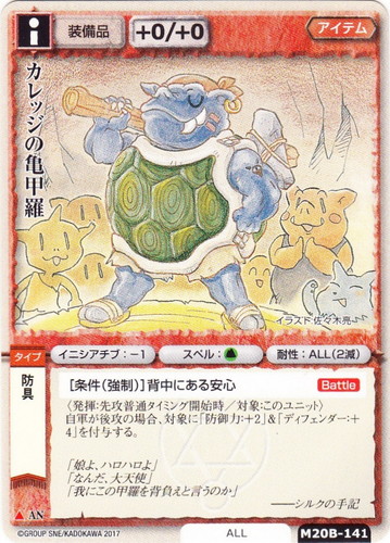 ![]() ![]() | M20B-141 カレッジの亀甲羅 アイテム 月の銀の魔狼 ▲ 分類:装備品 ブロック:AN 攻撃力:+0 防御力:+0 勢力:ALL タイプ:防具 イニシアチブ:-1 スペル:土 耐性:ALL(2減) コスト:■ [条件(強制)]背中にある安心【Battle】 〈発揮:先攻普通タイミング開始時/対象:このユニット〉 自軍が後攻の場合、対象に「防御力:+2」&「ディフェンダー:+4」を付与する。 「娘よ、ハロハロよ」 「なんだ、大天使」 「我にこの甲羅を背負えと言うのか」 ――シルクの手記 illustrated by 佐々木亮 |