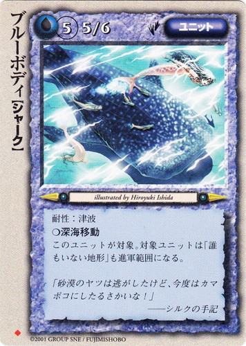 ![]() ![]() | ブルーボディ ユニット 魔法帝国の興亡 ◆ 属性:水 種族:シャーク レベル:5 攻撃力:5 防御力:6 進軍タイプ:歩行 耐性:津波 ○深海移動 このユニットが対象。対象ユニットは「誰もいない地形」も進軍範囲になる。 「砂漠のヤツは逃がしたけど、今度はカマボコにしたるさかいな!」 ――シルクの手記 illustrated by Hiroyuki Ishida |