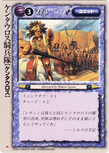 ![]() ![]() | ケンタウロス騎兵隊 ユニット 魔法帝国の興亡 ▲ 属性:風 種族:ケンタウロス レベル:(3) 攻撃力:2 防御力:3 進軍タイプ:歩行 イニシアチブ:+1 チャージ:+2 「レヴィンは我らと同じケンタウロスの郷里の出身。死体は埋めずにそのまま風にさらしてやってくれ」 ――シルクの手記 illustrated by Makoto Sajima |