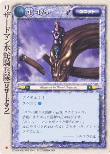 ![]() ![]() | リザードマン水蛇騎兵隊 ユニット 太陽王の覚醒 ◆ 属性:水 種族:リザードマン レベル:4 攻撃力:4 防御力:4 進軍タイプ:歩行 アイテム:1 スペル:水 「ココハ我ラガ碧鱗ノ王国。タチサラレヨ」 水蛇にまたがった碧鱗の民が叫びます。 「なにっ!アンタがワイと戦うのか!」 なにやらワケのわからないことをいう、アレックスでした。 ――シルクの手記 illustrated by Hiroki Haritama |