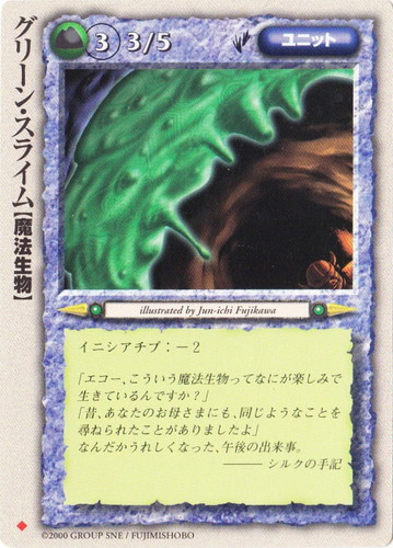 ![]() ![]() | グリーン・スライム ユニット 太陽王の覚醒 ◆ 属性:土 種族:魔法生物 レベル:3 攻撃力:3 防御力:5 進軍タイプ:歩行 イニシアチブ:-2 「エコー、こういう魔法生物ってなにが楽しみで生きているんですか?」 「昔、あなたのお母さまにも、同じようなことを尋ねられたことがありましたよ」 なんだかうれしくなった、午後の出来事。 ――シルクの手記 illustrated by Jun-ichi Fujikawa |