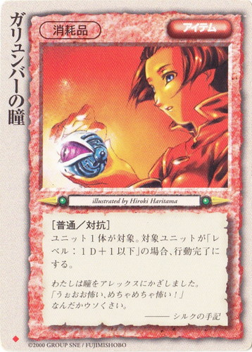 ![]() ![]() | ガリュンバーの瞳 アイテム 太陽王の覚醒 ◆ 分類:消耗品 [普通/対抗] ユニット1体が対象。対象ユニットが「レベル:1D+1以下」の場合、行動完了にする。 わたしは瞳をアレックスにかざしました。 「うぉおお怖い、めちゃめちゃ怖い!」 なんだかウソくさい。 ――シルクの手記 illustrated by Hiroki Haritama |