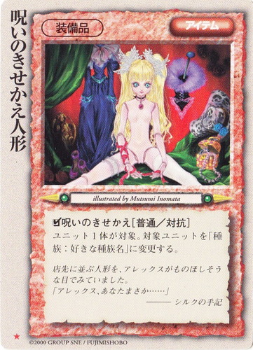 ![]() ![]() | 呪いのきせかえ人形 アイテム 太陽王の覚醒 ★ 分類:装備品 □呪いのきせかえ[普通/対抗] ユニット1体が対象。対象ユニットを「種族:好きな種族名」に変更する。 店先に並ぶ人形を、アレックスがものほしそうな目でみていました。 「アレックス、あなたまさか・・・・・・」 ――シルクの手記 illustrated by Mutsumi Inomata |