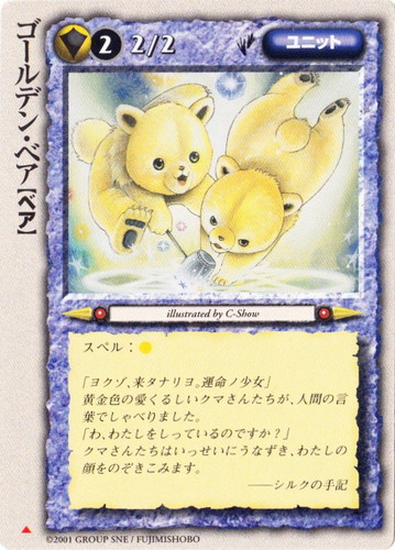![]() ![]() | ゴールデン・ベア ユニット 灼熱の百年戦争 ▲ 属性:聖 種族:ベア レベル:(2) 攻撃力:2 防御力:2 進軍タイプ:歩行 スペル:聖 「ヨクゾ、来タナリヨ。運命の少女」 黄金色の愛くるしいクマさんたいが、人間の言葉でしゃべりました。 「わ、わたしをしっているのですか?」 クマさんたちはいっせいにうなずき、わたしの顔をのぞきこみます。 ――シルクの手記 illustrated by C-Show |