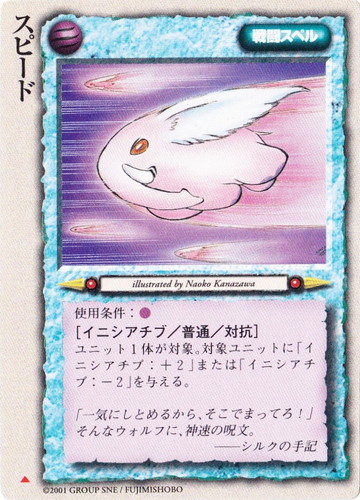 ![]() ![]() | スピード 戦闘スペル 灼熱の百年戦争 ▲ 属性:風 使用条件:風 [イニシアチブ/普通/対抗] ユニット1体が対象。対象ユニットに「イニシアチブ:+2」または「イニシアチブ:-2」を与える。 「一気にしとめるから、そこでまってろ! そんなウォルフに神速の呪文。 ――シルクの手記 illustrated by Naoko Kanazawa |