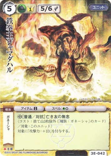 ![]() ![]() | 3E-042 鉄拳王ジャマダハル ユニット 竜神殿の巫女 ♣ 属性:土 分類:英雄 種族:ガネーシャ ブロック:II/III レベル:5 英雄点:1 攻撃力:5 防御力:6 進軍タイプ:歩行 アイテム:■ スペル:土* ◎[普通/対抗]亡き友の無念 〈コスト:捨て山3枚除外(「種族:ガネーシャ」のカード)/対象:このユニット〉 対象に「攻撃力:+1D」を付与する。 illustrated by しろー大野 |
