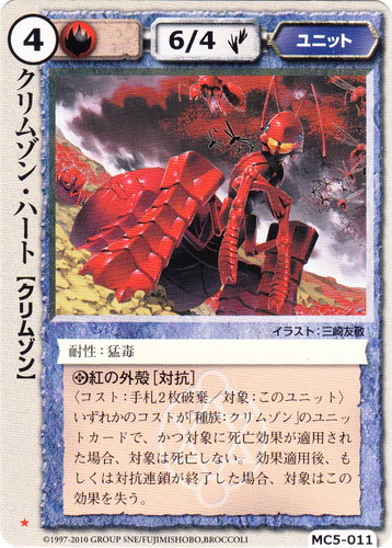 ![]() ![]() | MC5-011 クリムゾン・ハート ユニット 星剣姫の烙印 ★ 属性:火 種族:クリムゾン レベル:4 攻撃力:6 防御力:4 進軍タイプ:歩行 耐性:猛毒 ◎紅の外殻[対抗] 〈コスト:手札2枚破棄/対象:このユニット〉いずれかのコストが「種族:クリムゾン」のユニットカードで、かつ対象に死亡効果が適用された場合、対象は死亡しない。効果適用後、もしくは対抗連鎖が終了した場合、対象はこの効果を失う。 illustrated by 三崎友敬 |