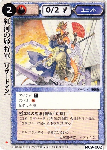 ![]() ![]() | MC9-001 紅河の炎帝 ユニット 紅河宮の精霊 ◆ 属性:火 種族:リザードマン レベル:(2) 攻撃力:2 防御力:2 進軍タイプ:歩行 イニシアチブ:+1 耐性:火炎 □溶岩の護り[普通/対抗] 〈対象:自軍パーティ〉対象が「耐性:火炎」を持つ場合、「防御力:+2」する。 「見よ、我が国の壮大な紅河の流れを」 「暑くてうっとうしいだけではないか」 ――七星魔導史 マフィン伝 illustrated by 伊藤勢 |