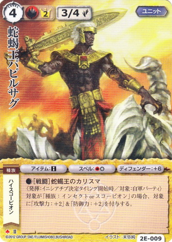 ![]() ![]() | 2E-009 蛇蝎王パピルサグ ユニット サーガランドの貴公子 ♣ 属性:火 分類:英雄 種族:ハイスコーピオン ブロック:II レベル:4 英雄点:2 攻撃力:3 防御力:4 進軍タイプ:歩行 アイテム:■ スペル:火* ディフェンダー:+6 ●[戦闘]蛇蝎王のカリスマ 〈発揮:イニシアチブ決定タイミング開始時/対象:自軍パーティ〉 対象が「種族:インセクトorスコーピオン」の場合、対象に「攻撃力:+2」&「防御力:+2」を付与する。 illustrated by 末弥純 |