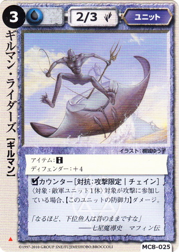![]() ![]() | MC8-025 ギルマン・ライダーズ ユニット 伏龍殿の覇者 ▲ 属性:水 種族:ギルマン レベル:(3) 攻撃力:2 防御力:3 進軍タイプ:歩行 アイテム:■ ディフェンダー:+4 □カウンター[対抗:攻撃限定|チェイン] 〈対象:敵軍ユニット1体〉対象が攻撃に参加している場合に、【このユニットの防御力】ダメージ。 「なるほど、下位魚人は昔のままですな」 ――七星魔導史 マフィン伝 illustrated by 槻城ゆう子 |
